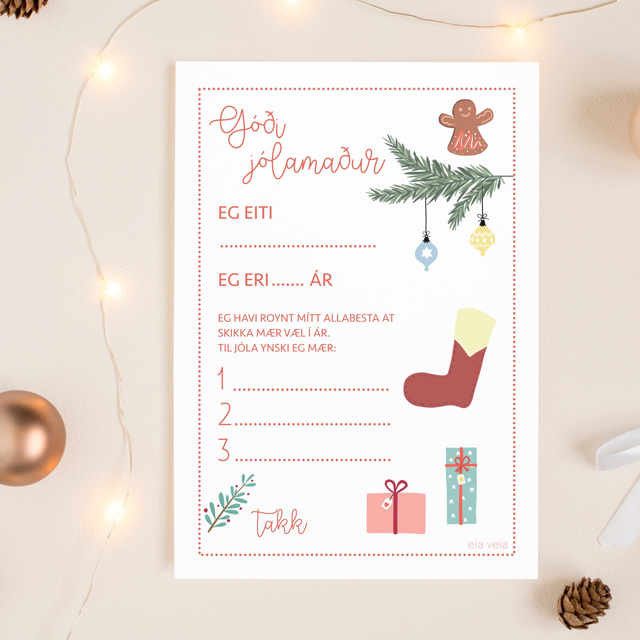 Lat børnini skriva síni ynskir til jólamannin við hesum fitta kortinum. Tað er ókeypis og tú skalt bara koyra tað í innkeypskurvina, og so fært tú eina PDF-fílu sendandi á tína teldupostadressu. Síðani kanst tú lætt og ómakaleyst prenta tað út og lata børnini skriva sína heilsan.